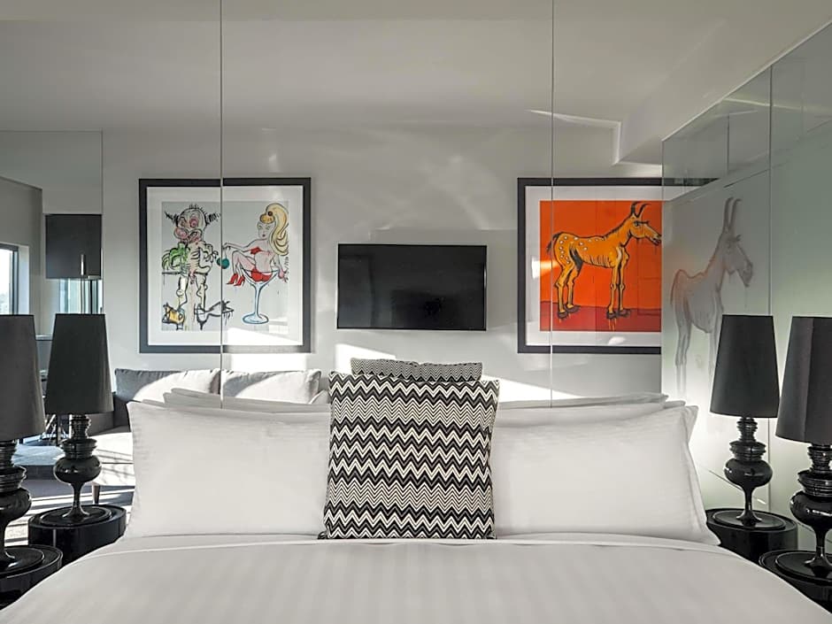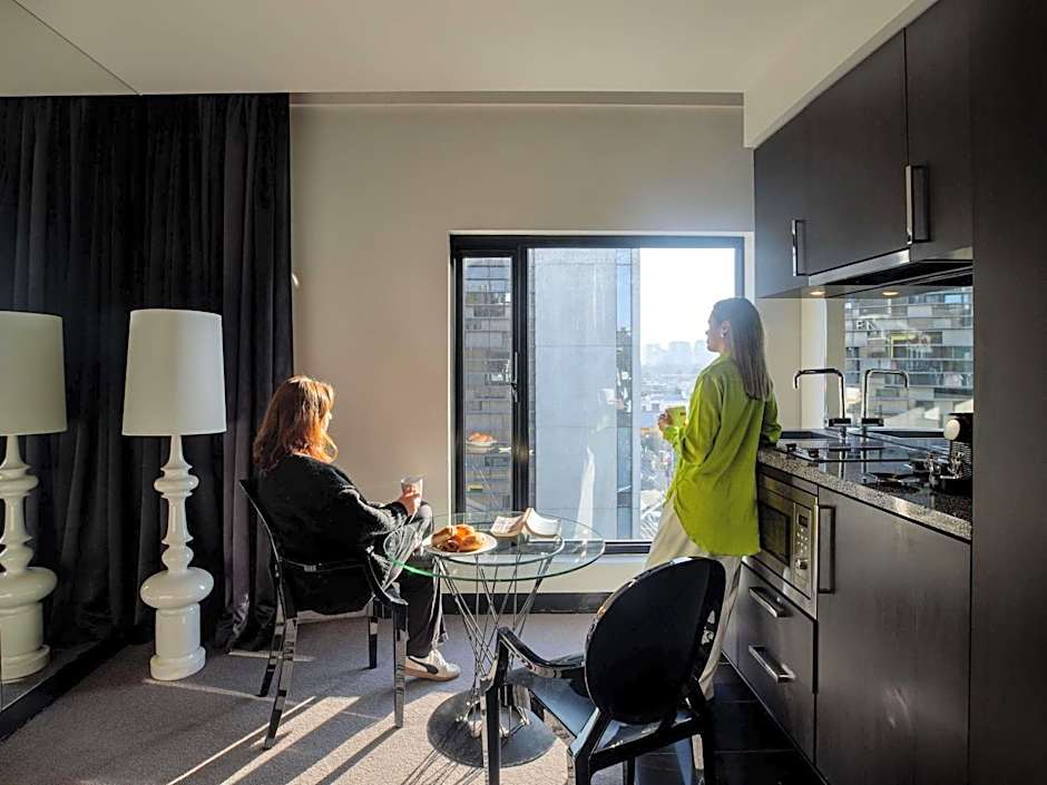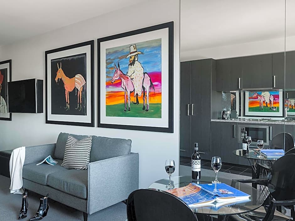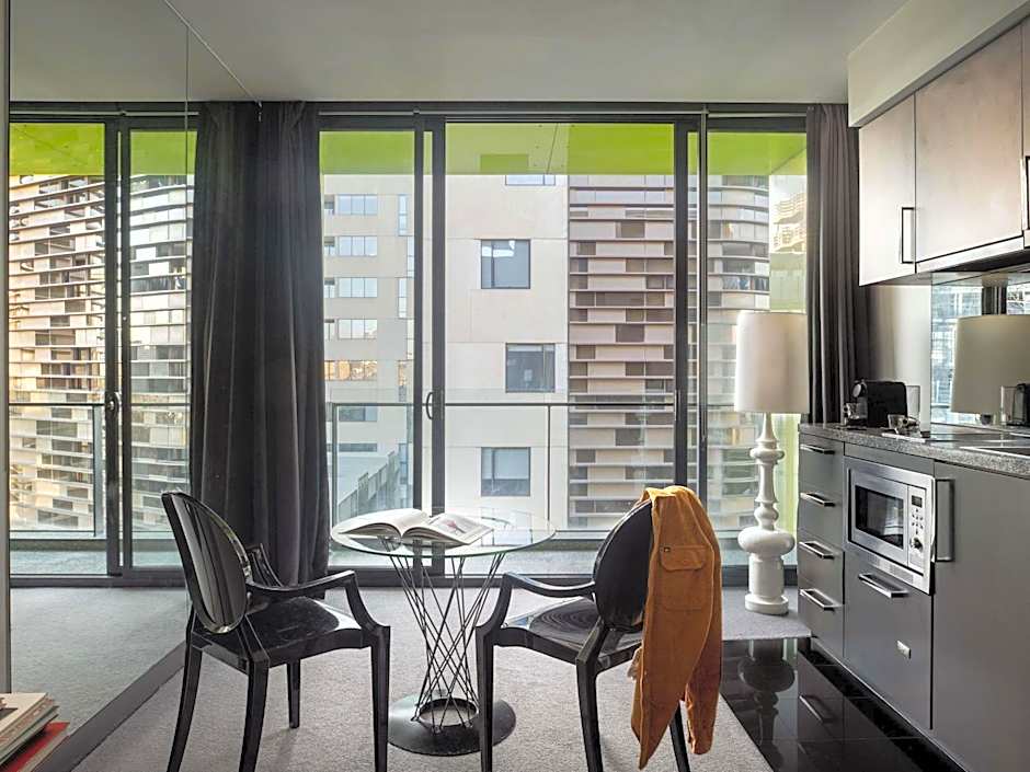 This suite has views over Melbourne city and offers a spacious living and dining area with flat-screen TV, sofa and iPod docking station. Features an open plan kitchenette, 2 bathrooms and a balcony with sun lounges and BBQ.
